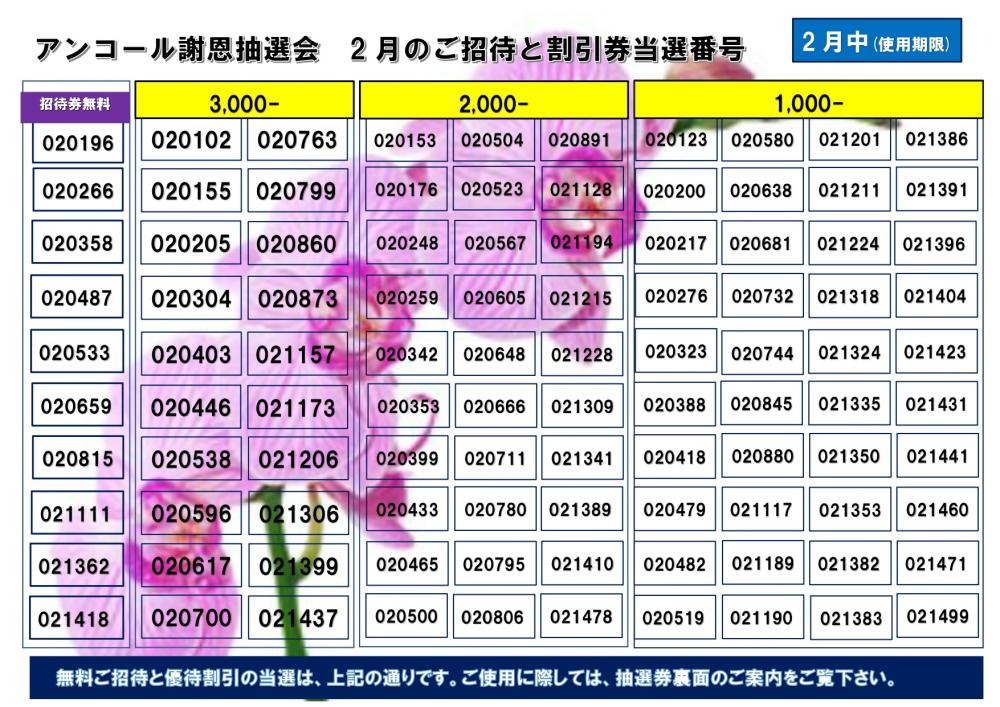 2026.01.31 リゾグラン エムグラン パルムドール ブロス エックス アンコール企画!無料ご招待&ご優待の当選発表!2月 40周年祭でご好評頂いた 【無料ご招待&ご優待抽選】が アンコール企画で戻って参りました! 楽しくご利用頂き、更に得しちゃおう♪ ぜひぜひ令和8年度も皆様のお越しをお待ちしております! それでは結果発表~!!! PREV NEXT TOP