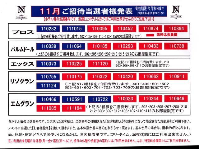 WEB宿泊&ラブホ女子会予約 HOTELS Reso Grand リゾグラン Em Grand エムグラン Parm d’or パルムドール BROS ブロス X エックス NEWS 2024.11.28 40周年企画 R6 11月 ご当選者様の発表です! リゾグラン エムグラン パルムドール ブロス エックス 2024.10.31 40周年企画 R6 10月 ご当選者様の発表です! リゾグラン エムグラン パルムドール ブロス エックス 2024.10.01 40周年企画 R6 9月 ご当選者様の発表です! リゾグラン エムグラン パルムドール ブロス エックス 2024.08.28 40周年企画 R6 8月 ご当選者様の発表です! リゾグラン エムグラン パルムドール ブロス エックス 2024.08.01 40周年企画 R6 7月 ご当選者様の発表です! リゾグラン エムグラン パルムドール ブロス エックス 2024.06.30 40周年企画 R6 6月 ご当選者様の発表です! リゾグラン エムグラン パルムドール ブロス エックス お知らせ一覧